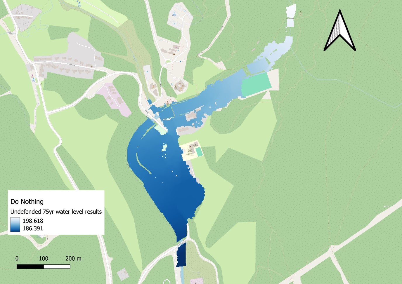 Figure 2. Undefended 1 in 75-year return period event flood extent and expected water levels