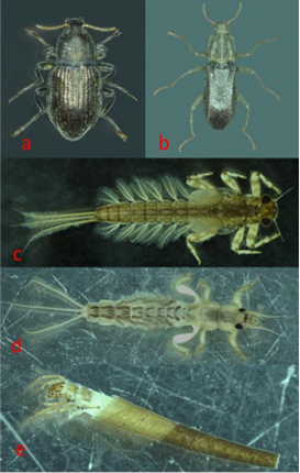 Macroinvertebrate species with high conservation value present in the Wye, a)Riolus nitens b)Stenelmis canaliculata c) Potamanthus luteus d) Ephemera lineata; e) Leptocerus interruptus (Not to scale with each other) To find out more about the types of monitoring we do in the Wye, visit our Citizen Science and Monitoring page.