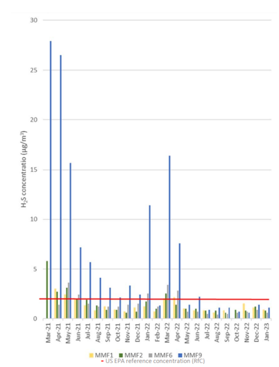 The graph below shows the monthly average concentration of H2S in the ambient air since March 2021. Since May 2022 all MMFs show H2S at or below the 2µg/m3 long-term lifetime health guidance value.