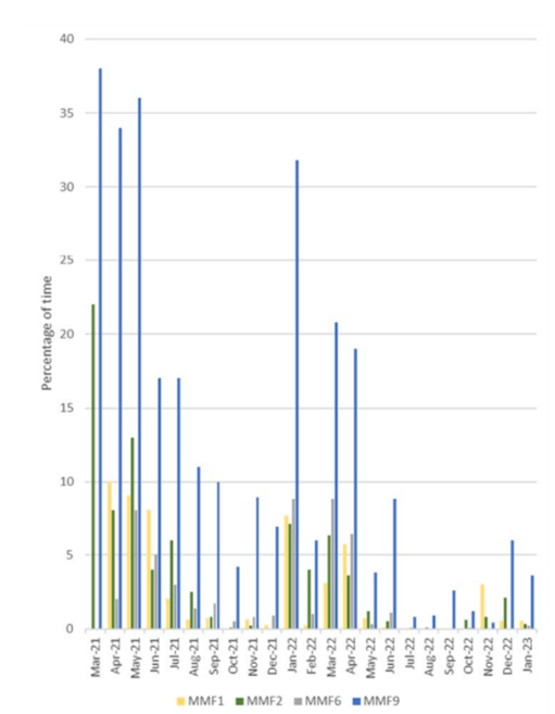 Figure 2: Monthly percentage of time that each monitoring station location has recorded hydrogen Sulphide concentrations above WHO odour annoyance guideline level (7µg/m3) (March 2021 – January 2023)