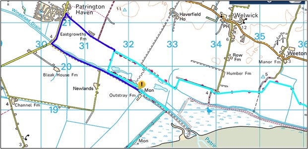 The current route for the diversion of the ECP at Outstrays Farm (shown in darker blue on the map to the right), avoiding the small bridge over Winestead Drain, will continue until next year.In spite of this, the boundary track around the wet grassland area (shown in turquoise) remains open for now. However, this will be closed to the public when work begins to strengthen this bridge in 2027. After this work is completed, the ECP diversion will be permanently removed, avoiding the long trek to Patrington Haven and down Mulberry Lane.