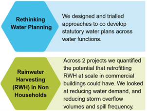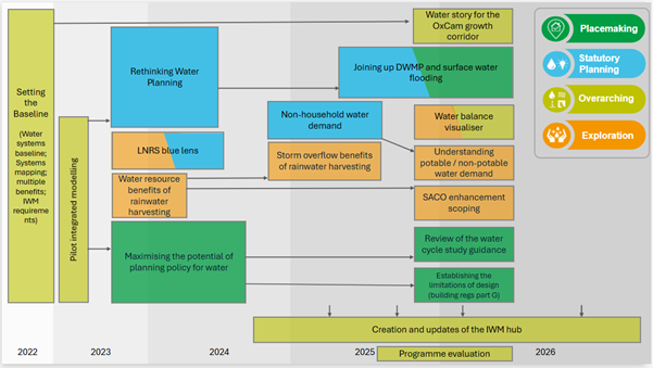 The diagram below illustrates how our programme has evolved, showing our progression from establishing the baseline: gathering evidence and building understanding of the challenges in creating water-resilient places, to identifying and responding to opportunities to help overcome these challenges and integrate water planning and delivery systems. By developing, testing, and trialling new approaches we are providing evidence, creating guidance, and shaping strategy, plans and policy to support the transition from business as usual to a more integrated approach to water management.