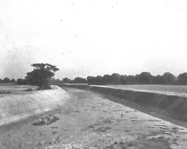 From Lolham Bridges to Tallington, a completely new channel had to be surveyed, designed and created. This channel runs alongside the main railway line before turning across the countryside to Tallington. It was dug to a channel bed width of 45 feet and required 92,000 cubic yards of soil to be excavated. This soil was then used to build the flood embankments on either side of the cut. As before, the excavations were completed by G. Wimpey & Co., and the embankments were formed by the Welland River Board.