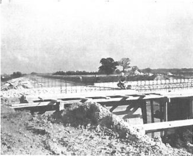 Along this section, the bed width of the channel varied between 45 and 50 feet, and around 242,000 cubic yards of soil had to be removed. The main excavation works were carried out by G. Wimpey & Co., while the River Welland Catchment Board’s workforce formed and shaped the embankments.