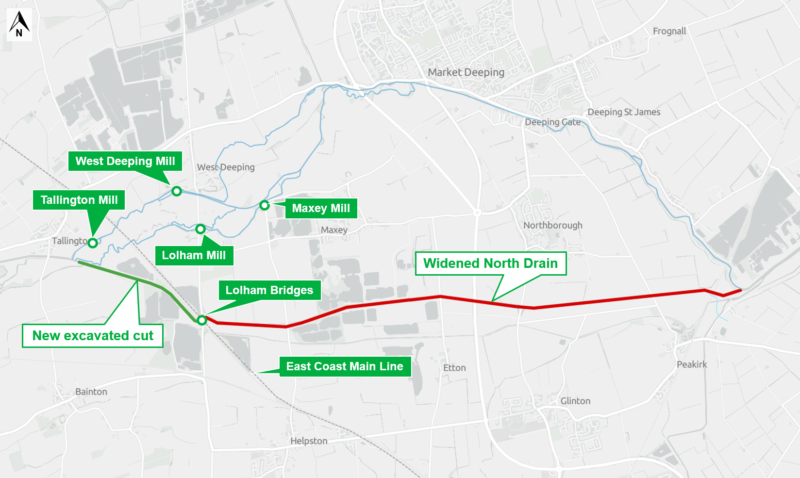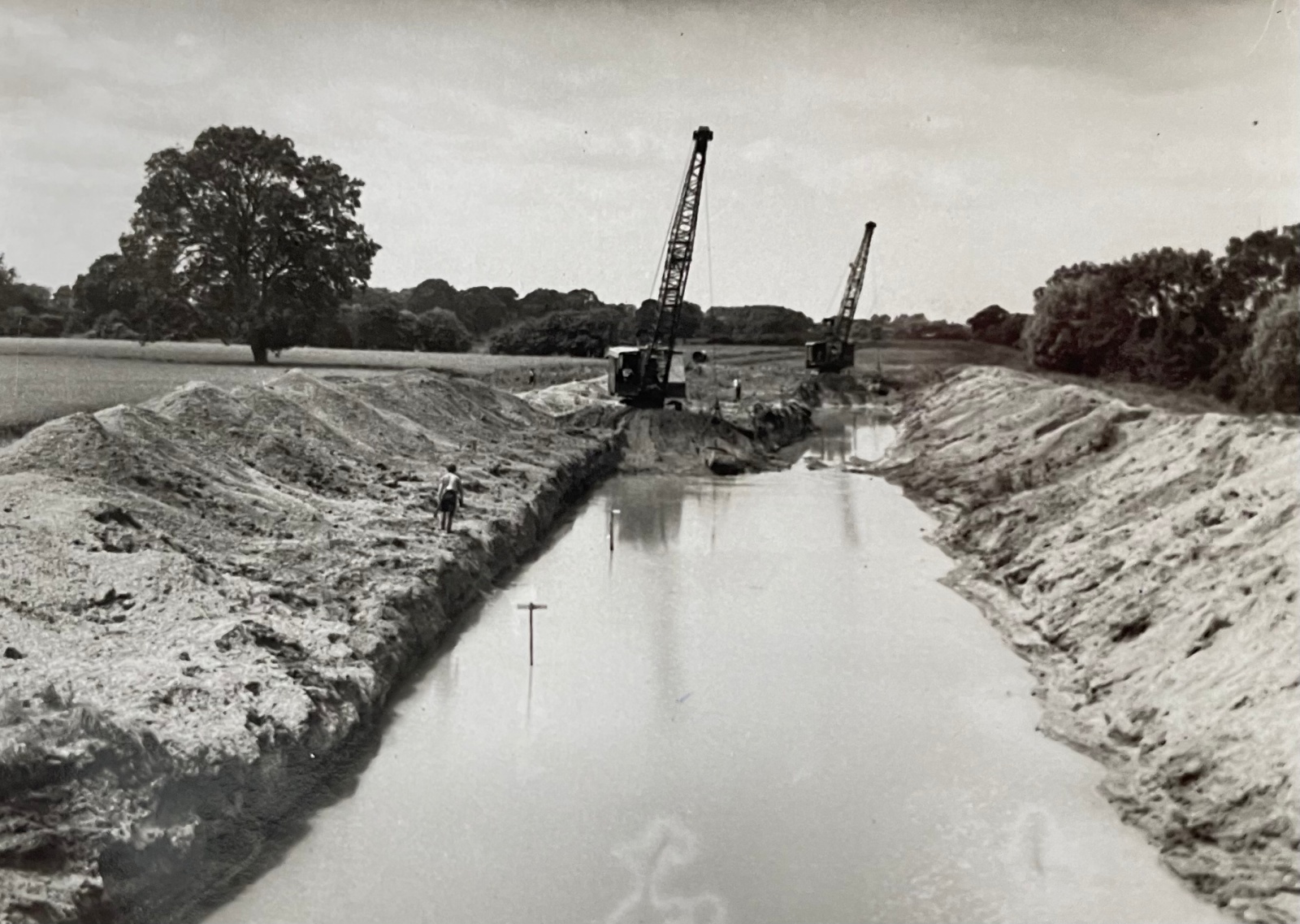 Giant diggers were used to widen and reshape the old Maxey North Drain, running from Peakirk and extending as far upstream as Lolham Bridges. The soil dug out from these excavations was used to build the flood embankments on either side of the cut to prevent any further flooding of the surrounding land.