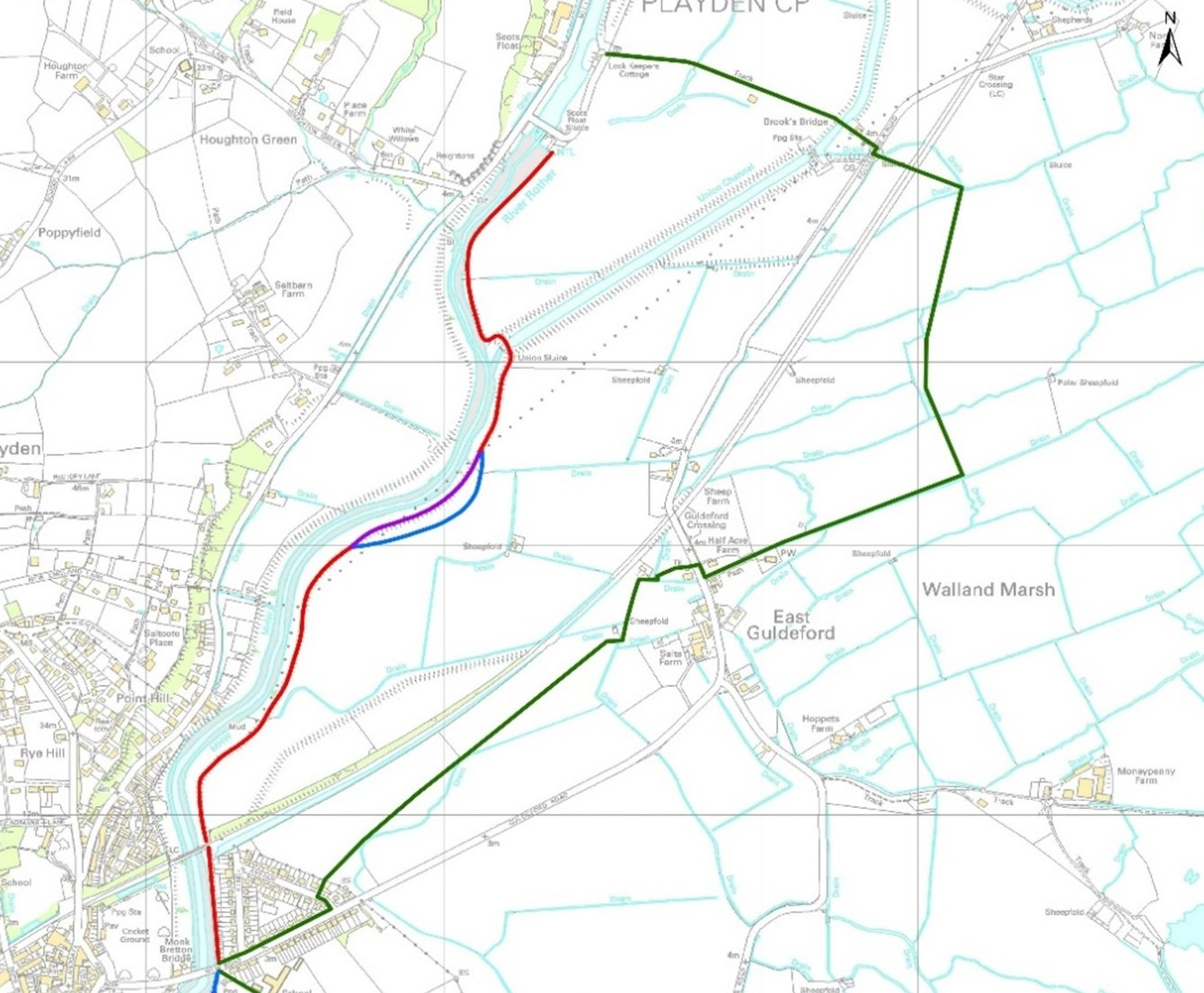 Purple - Existing PROW on existing flood embankment requiring closure and permanent diversion