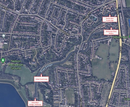 Figure 2 - Bridges requiring improvements located on the River Mole (Copyright Google 2023)