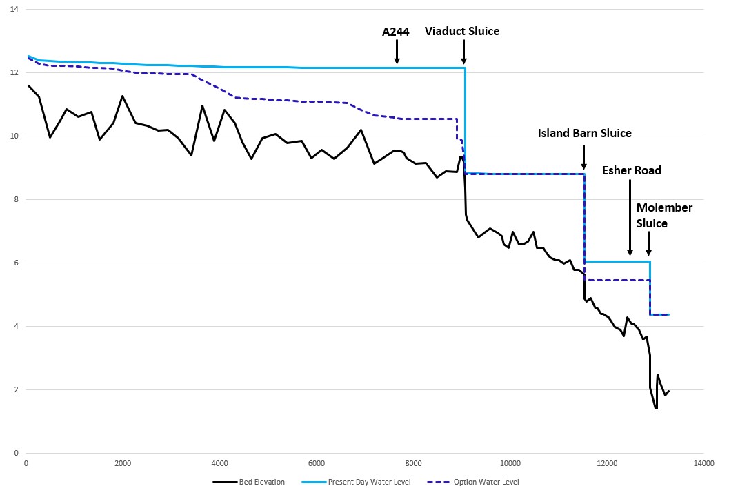 A new rock ramp weir would be constructed within the River Ember upstream of the Royal Mills channel offtake which would result in a 1.6m reduction in water levels upstream of the rock ramp when compared to the present day situation.