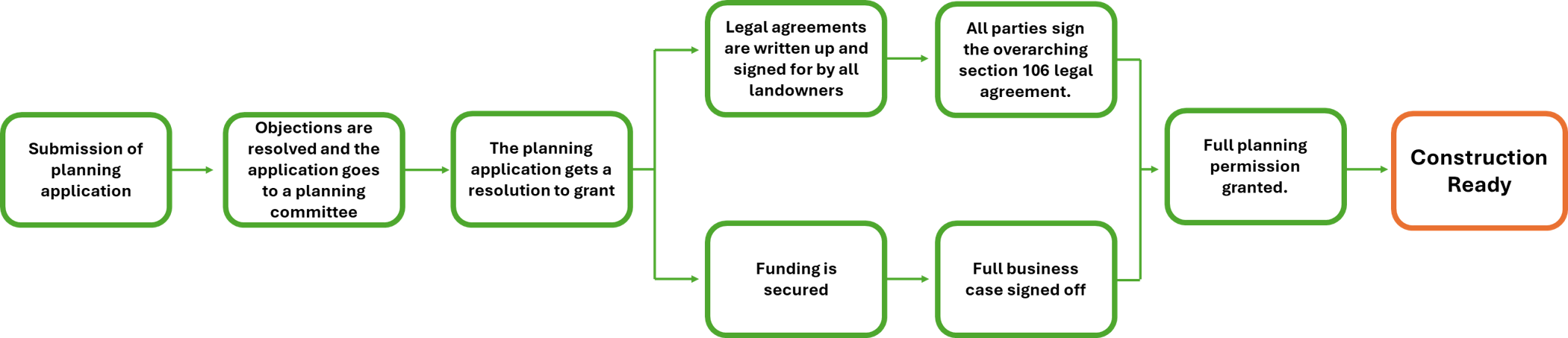 Below is a flow chart that outlines the process of how the project will go through the planning process to become construction ready. Due to uncertainties around the time impacts that securing legal agreements and funding could have we do not have an exact date for when construction will start. We are aiming to be construction ready by December 2026.