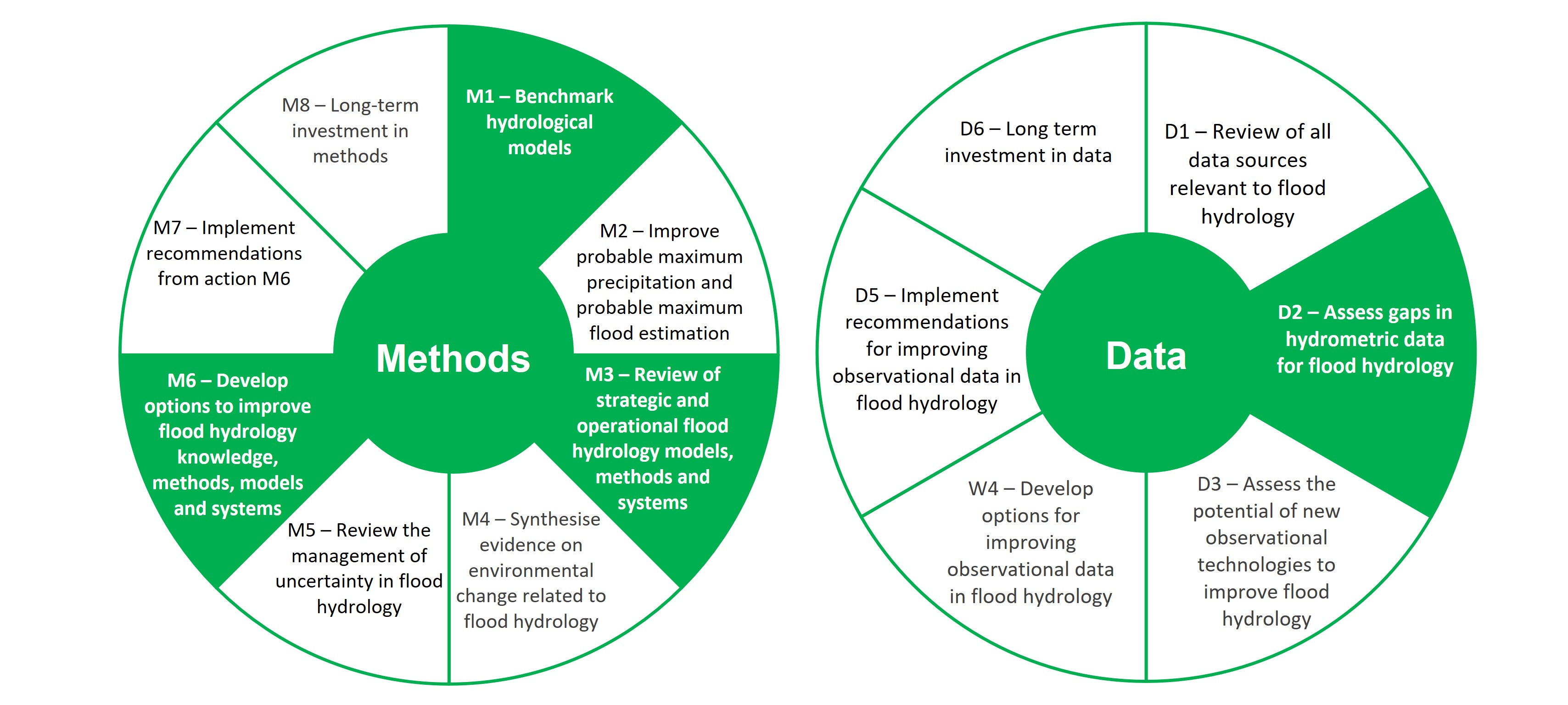 The UK Flood Hydrology Roadmap will be realised through 31 actions grouped into 4 thematic work areas of ways of working, data, methods and scientific understanding. Eight actions have been identified to improve methods in UK flood hydrology related to improving flood hydrology methods, models and systems. Six actions have been identified to improve data in U.K. flood hydrology related to improving long term data quality, quantity and accessibility.