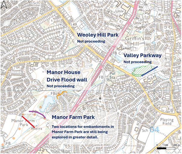 The most effective means to reduce flood risks is to slow the flow from upstream by capturing water in temporary flood storage areas. In an urban area there is limited opportunities to do this and we identified three locations: Weoley Hill Park, Valley Parkway and Manor Farm Park. Earlier last year Weoley Hill was ruled out due to the lack of space, and we progressed options within Valley Parkway and Manor Farm Parks.